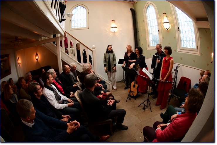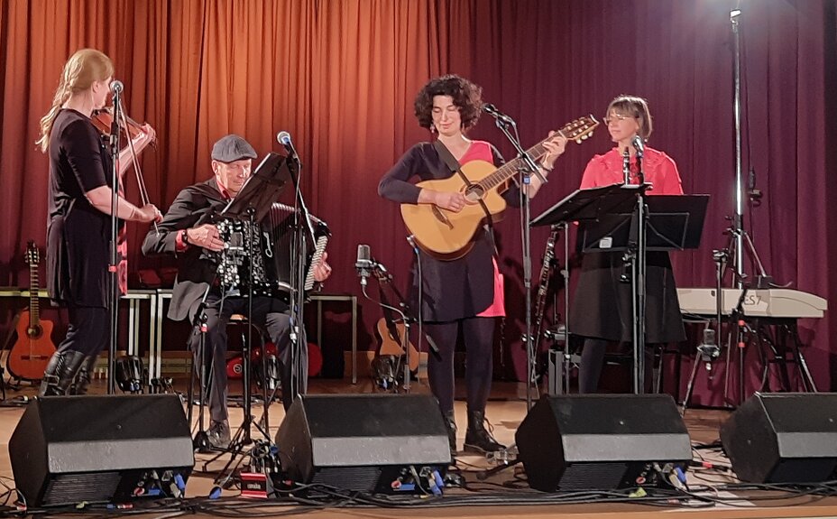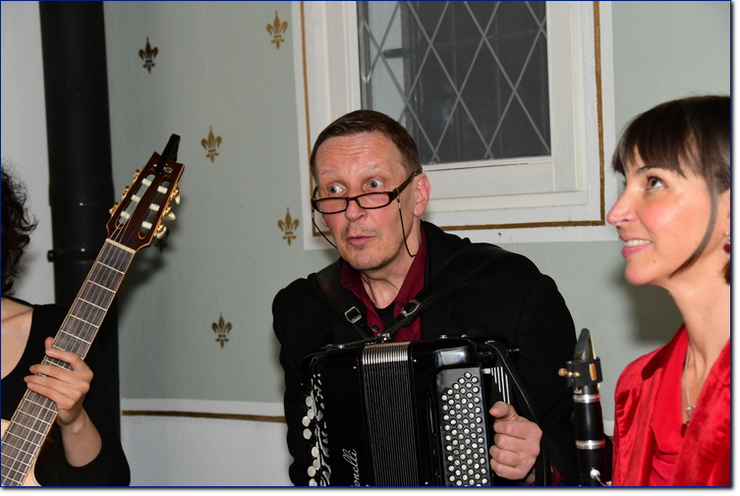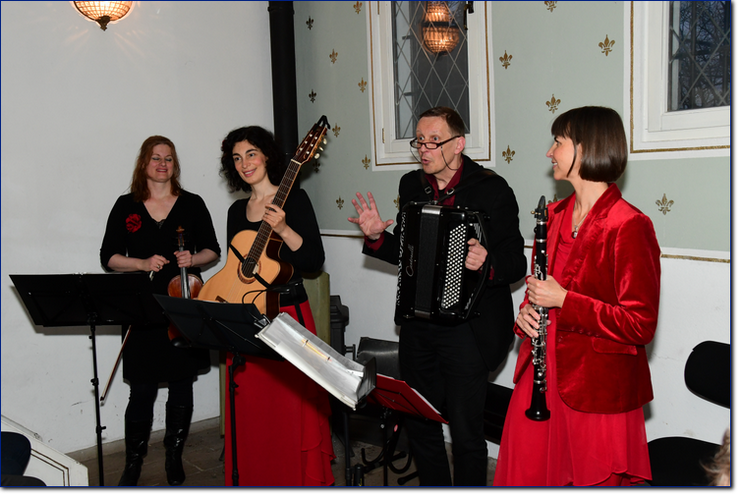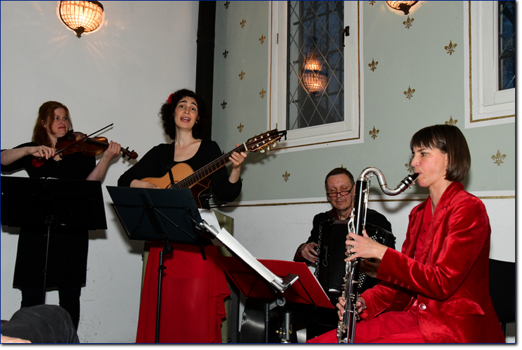 Mit den Musikerkollegen von Dorothea Greve: Anna Vishnevska (Gesang), Stefan Goreiski (Akkordeon), Maike Spieker (Klarinette), Taly Almagor (Violine), Stella Jürgensen und Inge Mandos (Gesang)